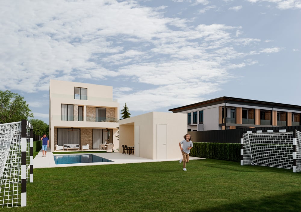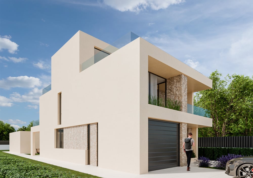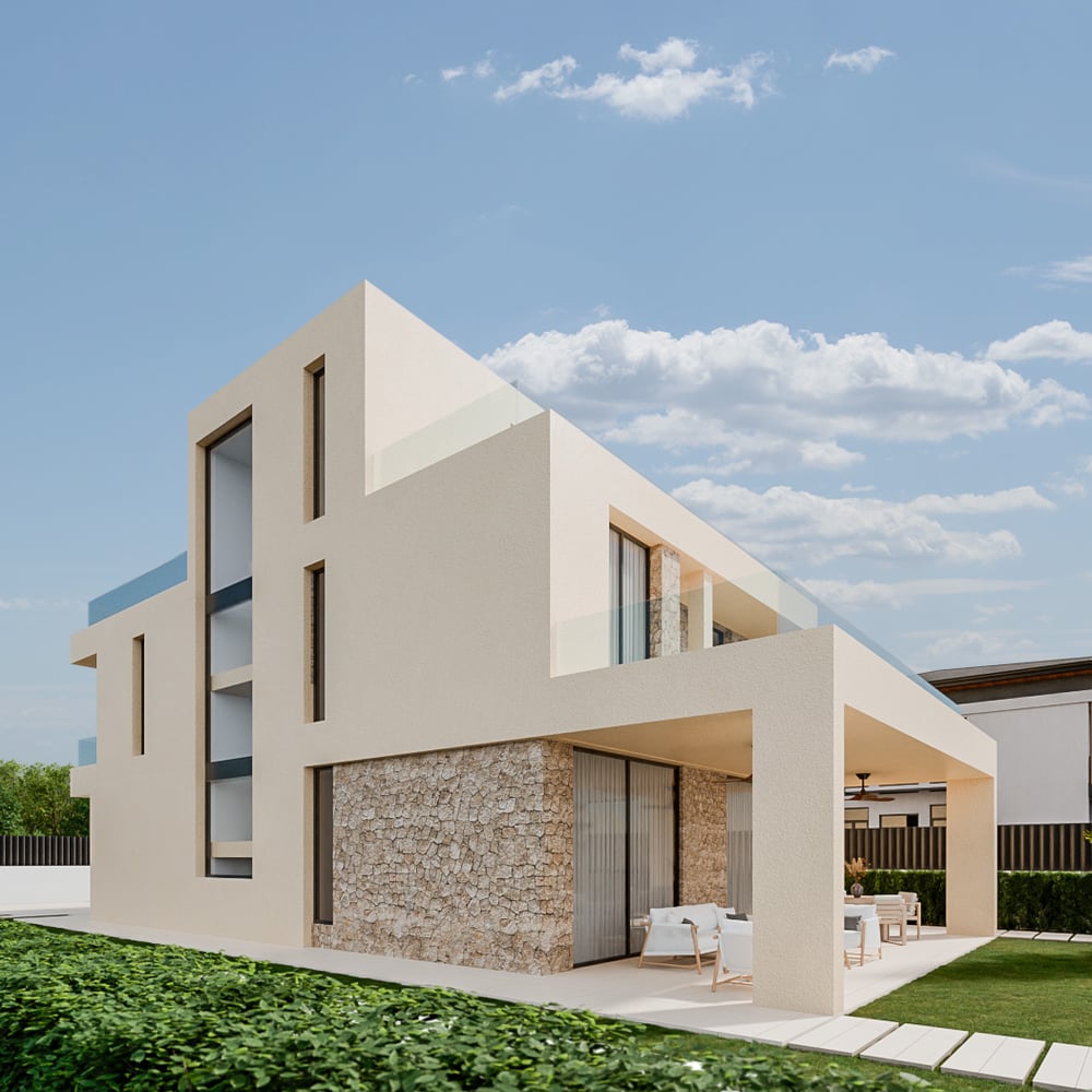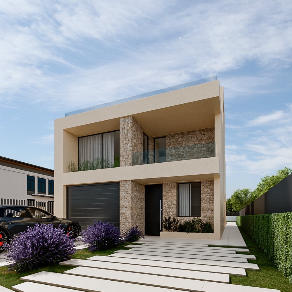 Serie de imágenes desarrolladas para la presentación de la rehabilitación integral de una vivienda unifamiliar de dos plantas. El proyecto transforma la construcción original mediante una actualización volumétrica y material que le otorga un lenguaje contemporáneo, limpio y atemporal.